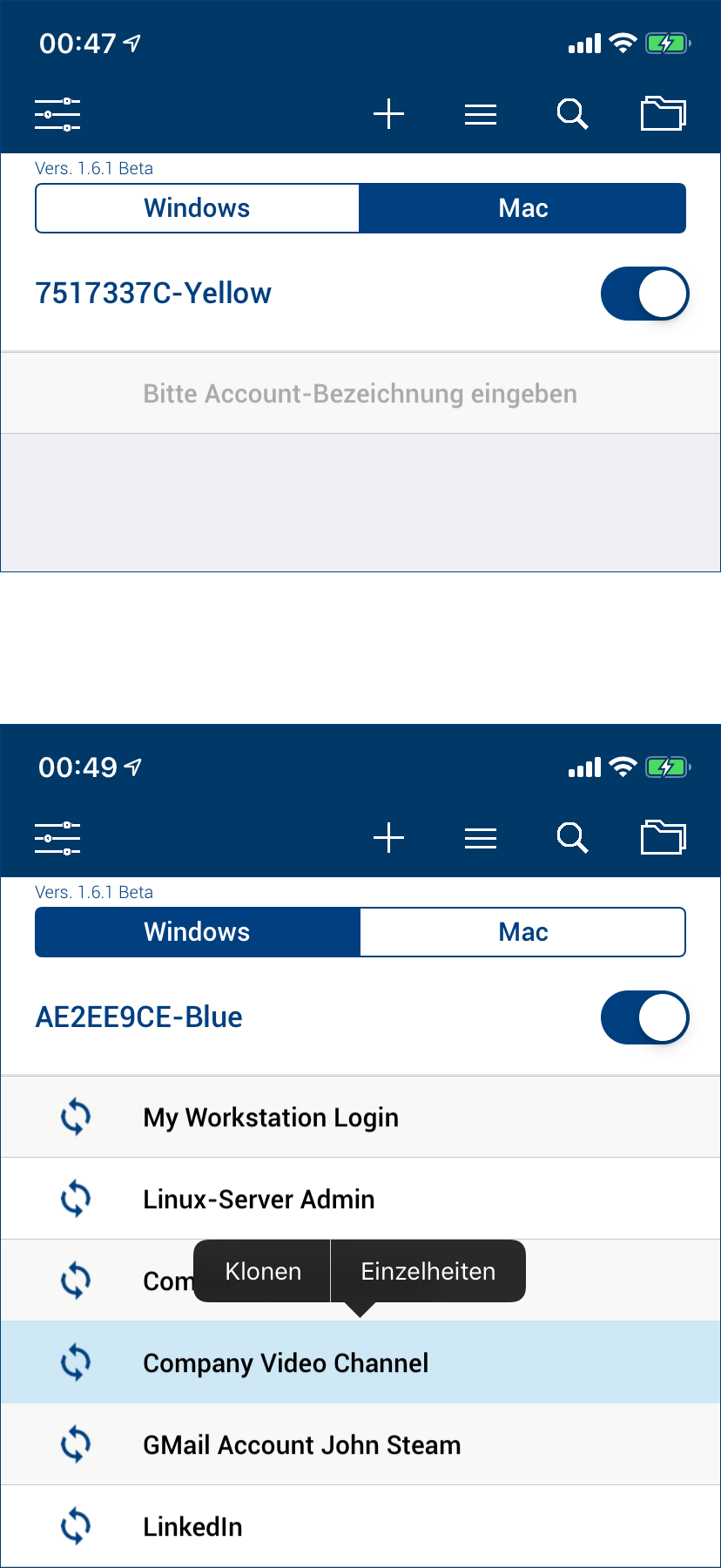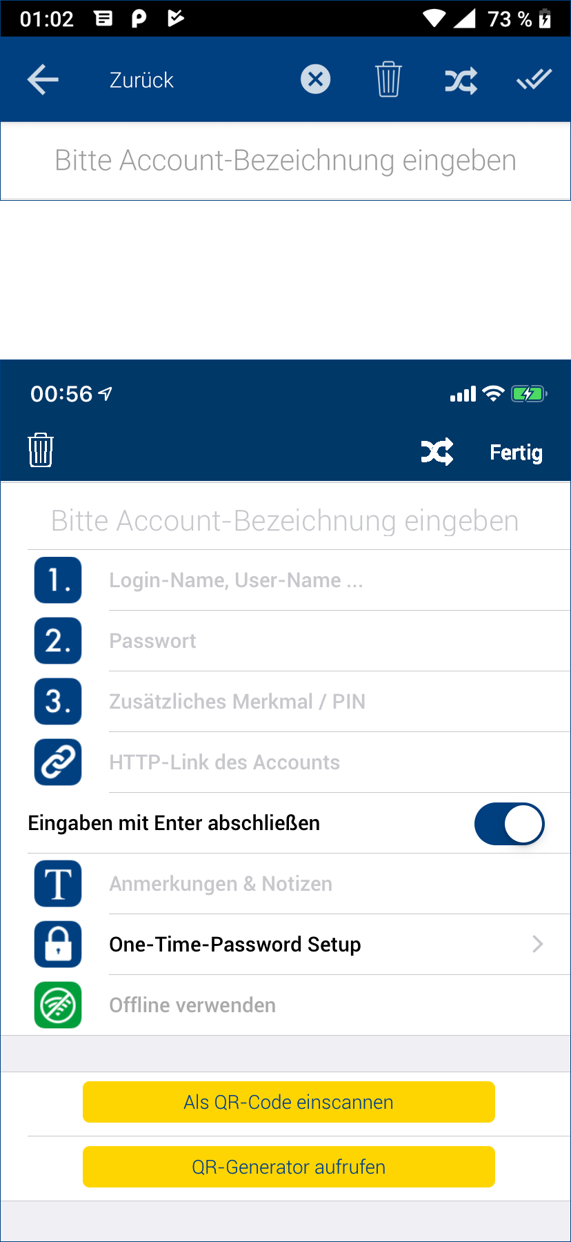 With the two yellow buttons you can scan the login data easily and comfortably with self generated QR codes. This works fast and is very practical if you have to enter several login data at the beginning. You will find the necessary information on how this works under „How To – Scan login data“.