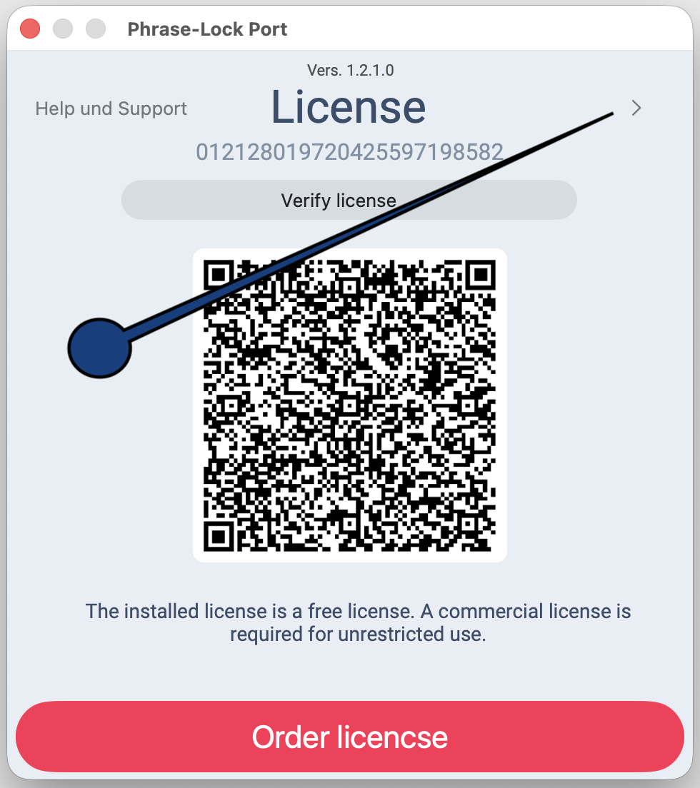 Once the free license has been installed correctly, you’ll see a QR code in the center that you can use to connect your smartphone to Phrase-Lock Port on your computer. Before you do that, however, you’ll need to open the second setup menu and run a connection check. To do this, click the triangle in the top-right corner, as shown.