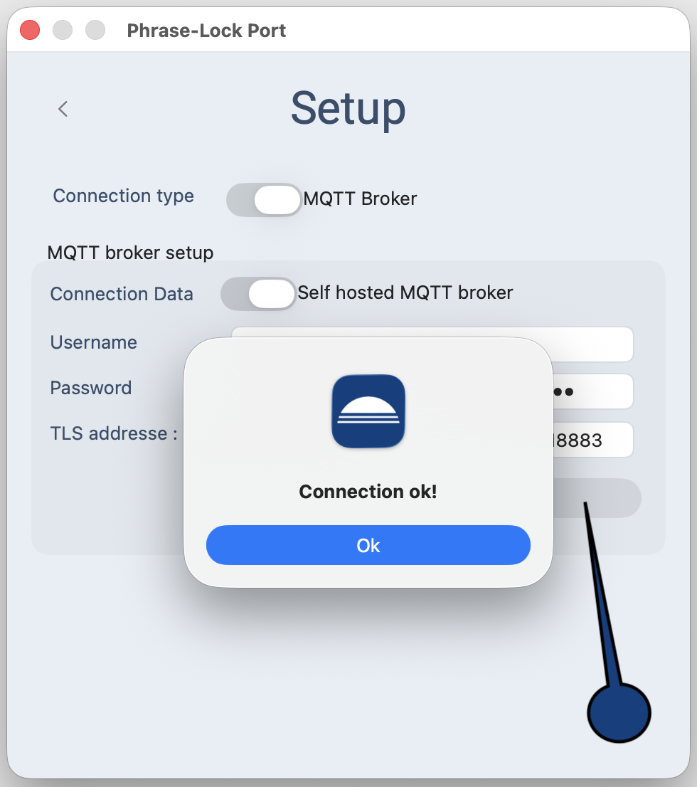 Now click the blue Test button. The message “Connection ok” should appear. Confirm the message.