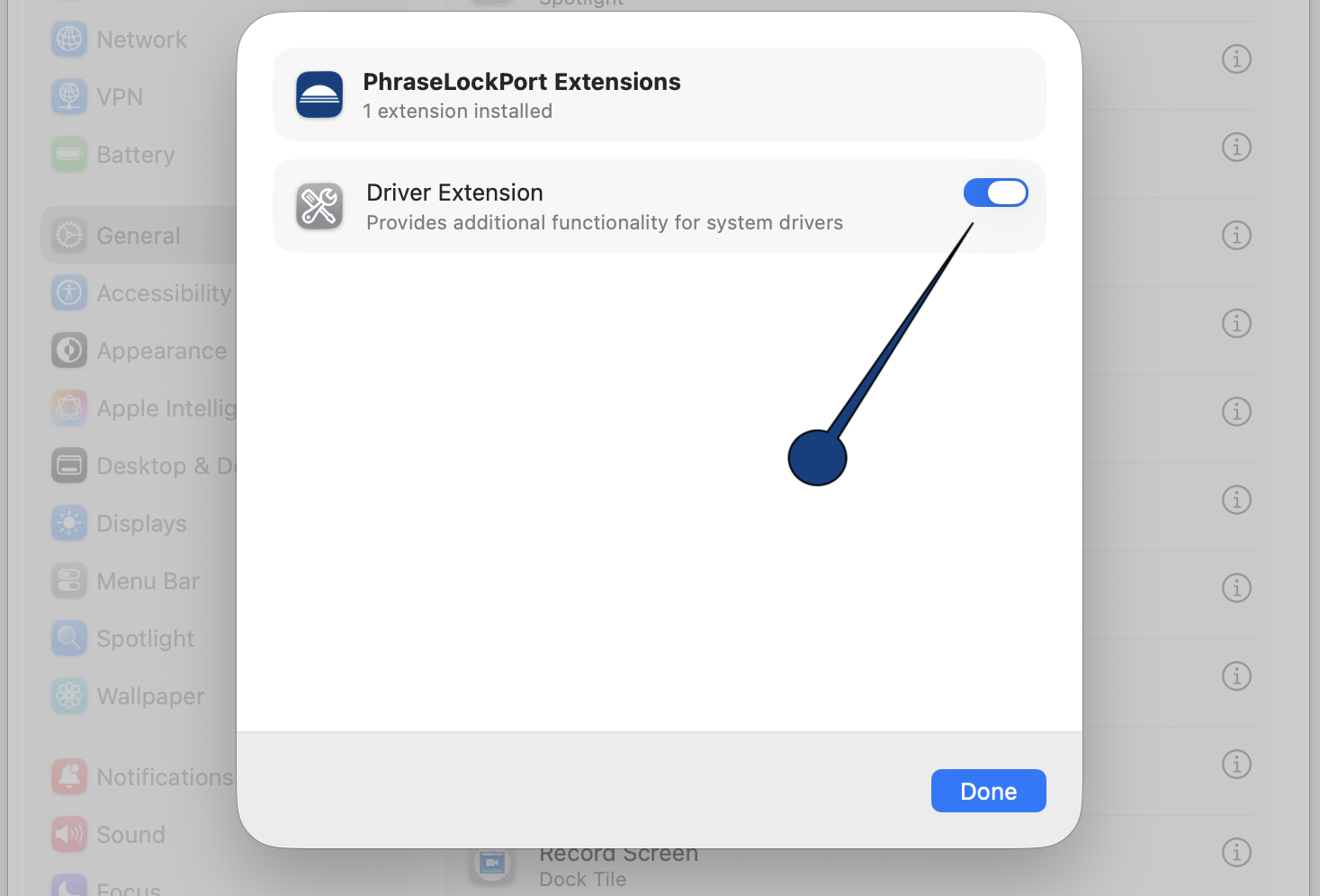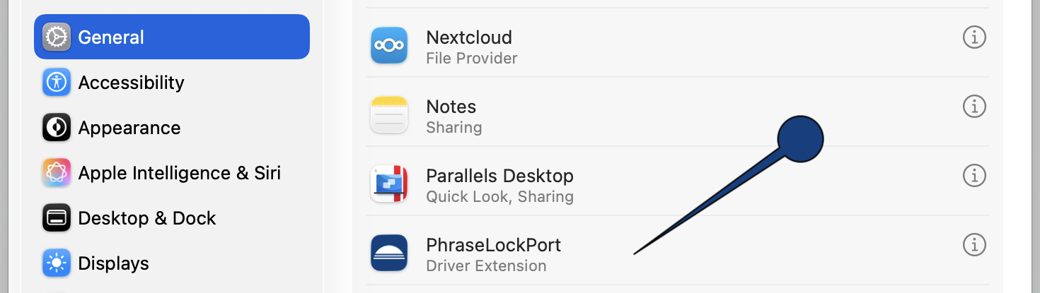 First, go to General – Login Items & Extensions in the settings and look for the Phrase‑Lock entry. Click the info icon on the right side of that row.