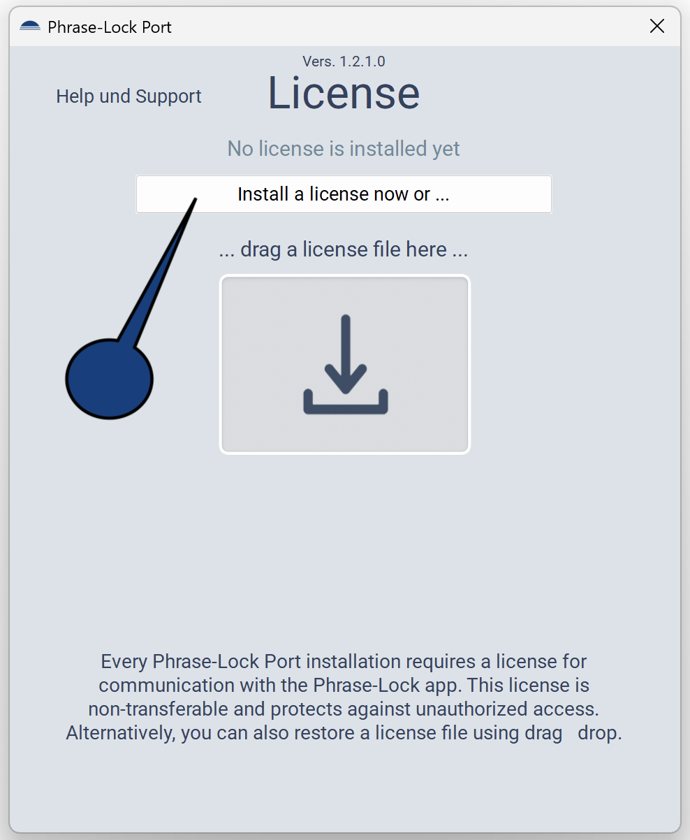 Once the free license has been installed correctly, you’ll see a QR code in the center that you can use to connect your smartphone to Phrase-Lock Port on your computer. Before you do that, however, you’ll need to open the second setup menu and run a connection check. To do this, click the triangle in the top-right corner, as shown.