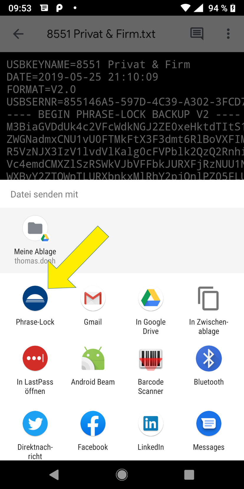 Once you have found this send menu item, a list will open with the Phrase-Lock logo. Tap on it and follow the message on your display.