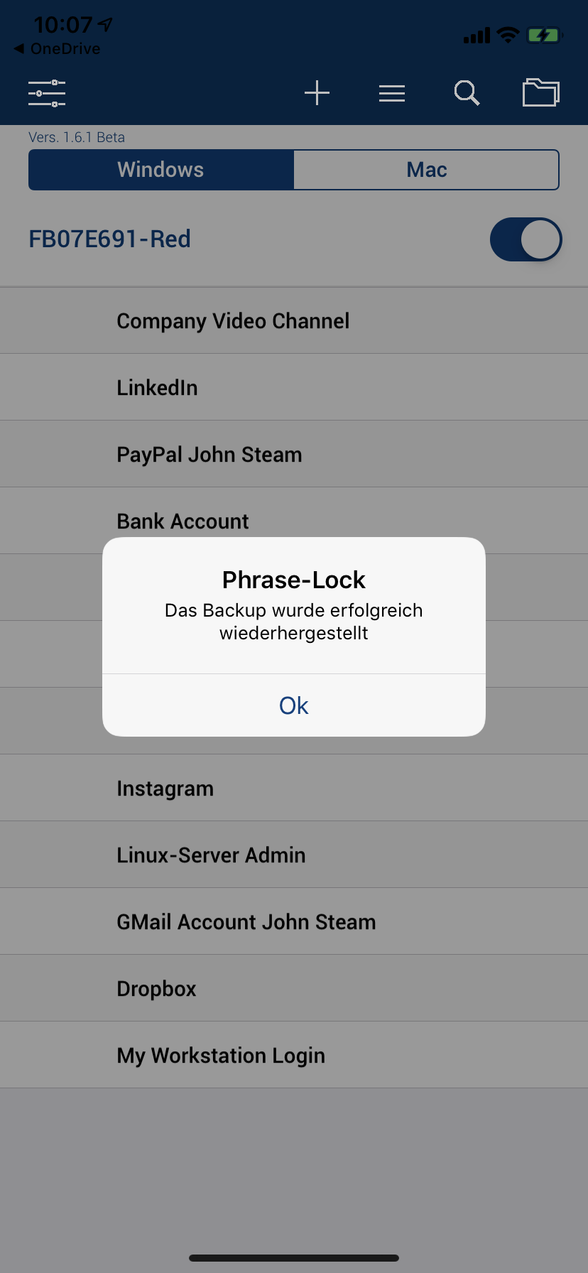 Please note: To restore a backup, you must re-import the previously created backup file. To do this, use the same tool that you used for saving. Phrase-Lock itself does not access your files or any other of your services for importing a backup. This would require special rights that we do not want for reasons of security and discretion for Phrase-Lock.