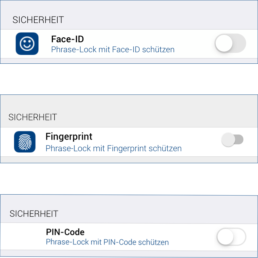 Sie sehen hier drei Ausprägungen, abhängig vom Gerät und dessen Einstellungen, wie ein zusätzlicher Schutz für Phrase-Lock ausgestaltet sein kann. Um die jeweilige Möglichkeit zu aktivieren, gehen Sie bitte in „Einstellungen – Sicherheit“ und tippen Sie auf den Schalter rechts.