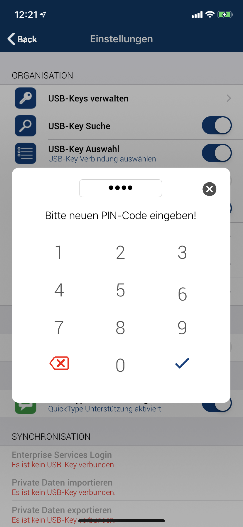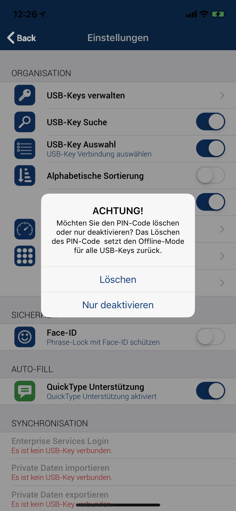 Voraussetzung für die Aktivierung dieser Funktion ist die Festlegung eines PIN-Codes. Beim Aktivieren von Fingerprint oder Face-ID, oder nur des PIN-Codes, wird im Key-Store Ihres Telefons ein gesicherter Daten-Container angelegt, in dem auch der Hauptschlüssel Ihres USB-Keys hinterlegt wird, wenn Sie dessen Offline-Funktion aktivieren.